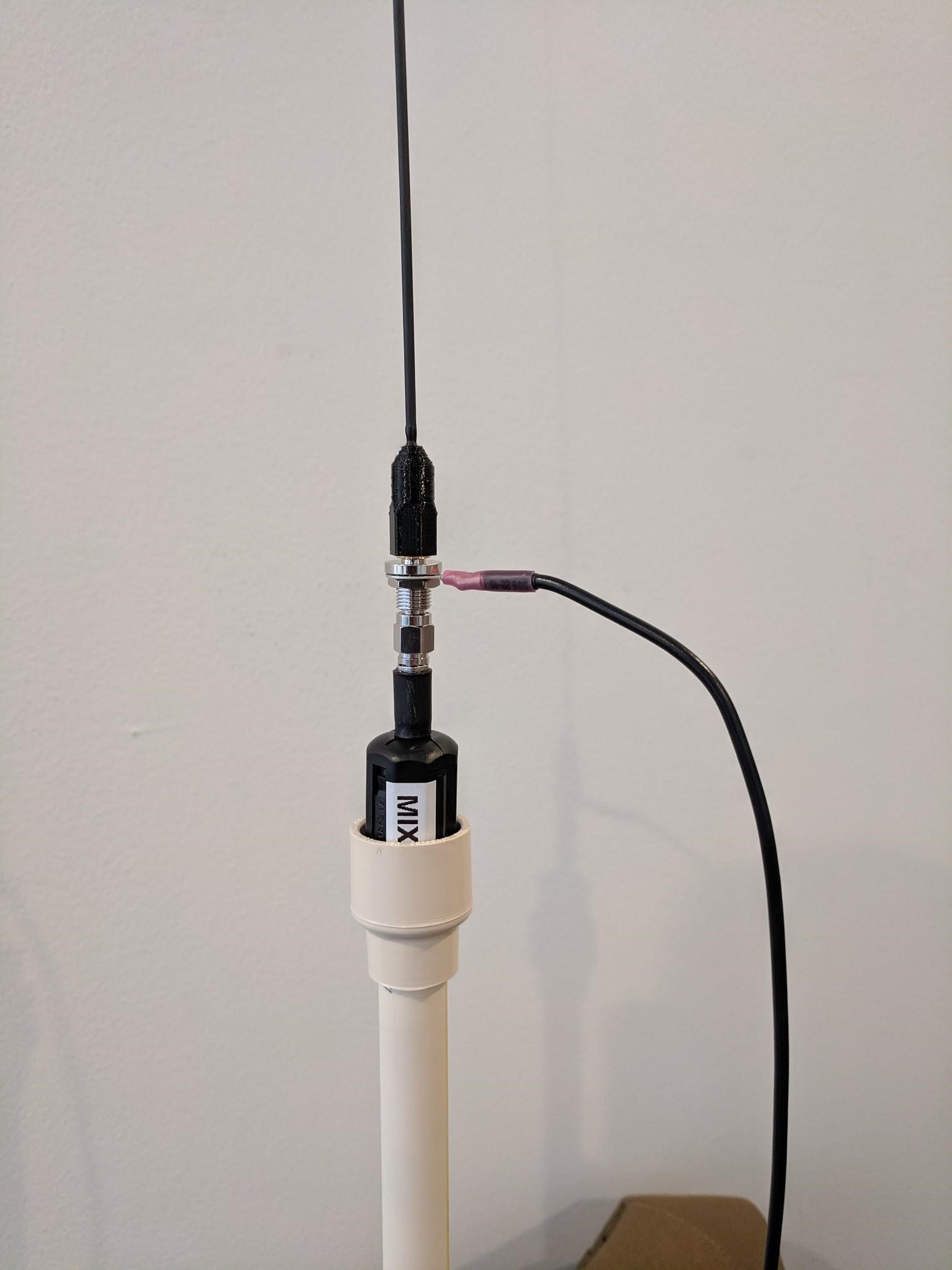The primary element of the antenna is a 2m Signal Stick[7]. I chose the Signal Stick over other similar aftermarket ¼ wave antennas due to its superior flexibility. The Signal Stick should easily handle the occasional branch or other obstacle while on the trail. An 19.5” tiger tail of 18 gauge antenna wire makes up the second half of the dipole. We learned from our experimenter extraordinaire, John KX4O[8], that using a tiger tail with a ¼ wave aftermarket antenna is superior to using the ¼ wave antenna alone. The Signal Stick and tiger tail are attached to the feedline with a female to female SMA bulkhead connector[9]. The bulkhead connector provides the base plate and fastener for attaching the tiger tail. The final element is a Mix 31 Clamp-On ferrite[10] near the SMA bulkhead connector to prevent common mode currents on the feedline. A Mix 31 ferrite is ideal for 2m transmission with a peak impedance near 150MHz. If you prefer 70cm operation then a Mix 61 ferrite would be a better option as it shifts the peak impedance frequency toward 440MHz. The antenna assembly then sits semi-snuggly into a ½” to ¾” CPVC fitting at the top of the mast. The ¾” CPVC fitting internal diameter is conveniently the perfect size for the ferrite.